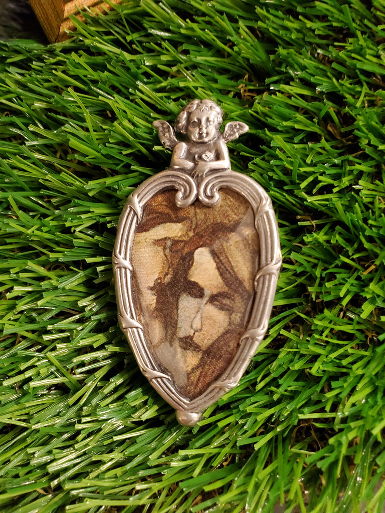 4 inch framed cherub pewter brooch