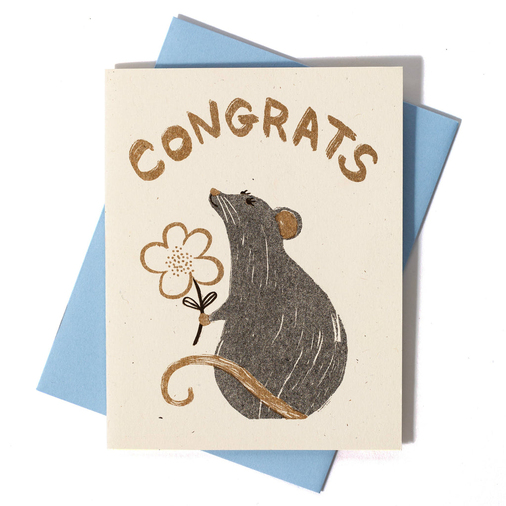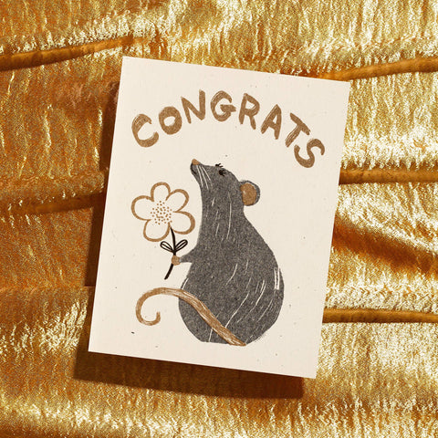 A sweet gray rat offers a flower of cong-rat-ulations. Risograph printed in black and metallic gold.
