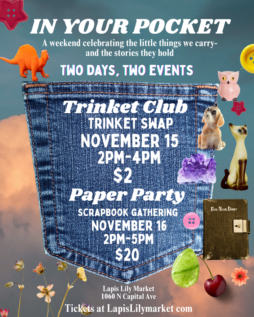 Join us for In Your Pocket, a cozy afternoon of connection, creativity, and curiosity at Lapis Lily Market! Bring a few small treasures—trinkets, charms, mini keepsakes, or pocket-sized curios—and swap them with others in a celebration of pocket sized trinkets.